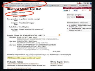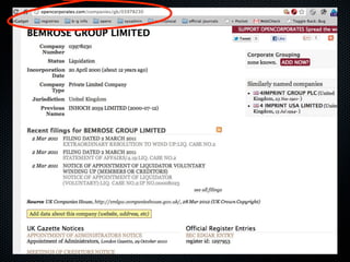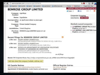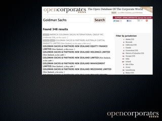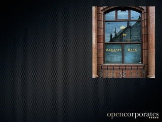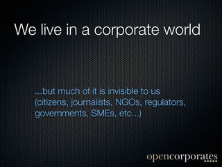The document discusses the increasing complexity and opacity of corporate structures and the urgent need for transparent access to company data in order to enhance accountability and governance. It highlights the disparity in access to critical public data and the systemic issues arising from a lack of understanding, which can lead to problems like pollution exporting and corporate malpractice. The author advocates for initiatives such as OpenCorporates that aim to create an openly licensed database of corporate entities to improve visibility and oversight in the corporate world.