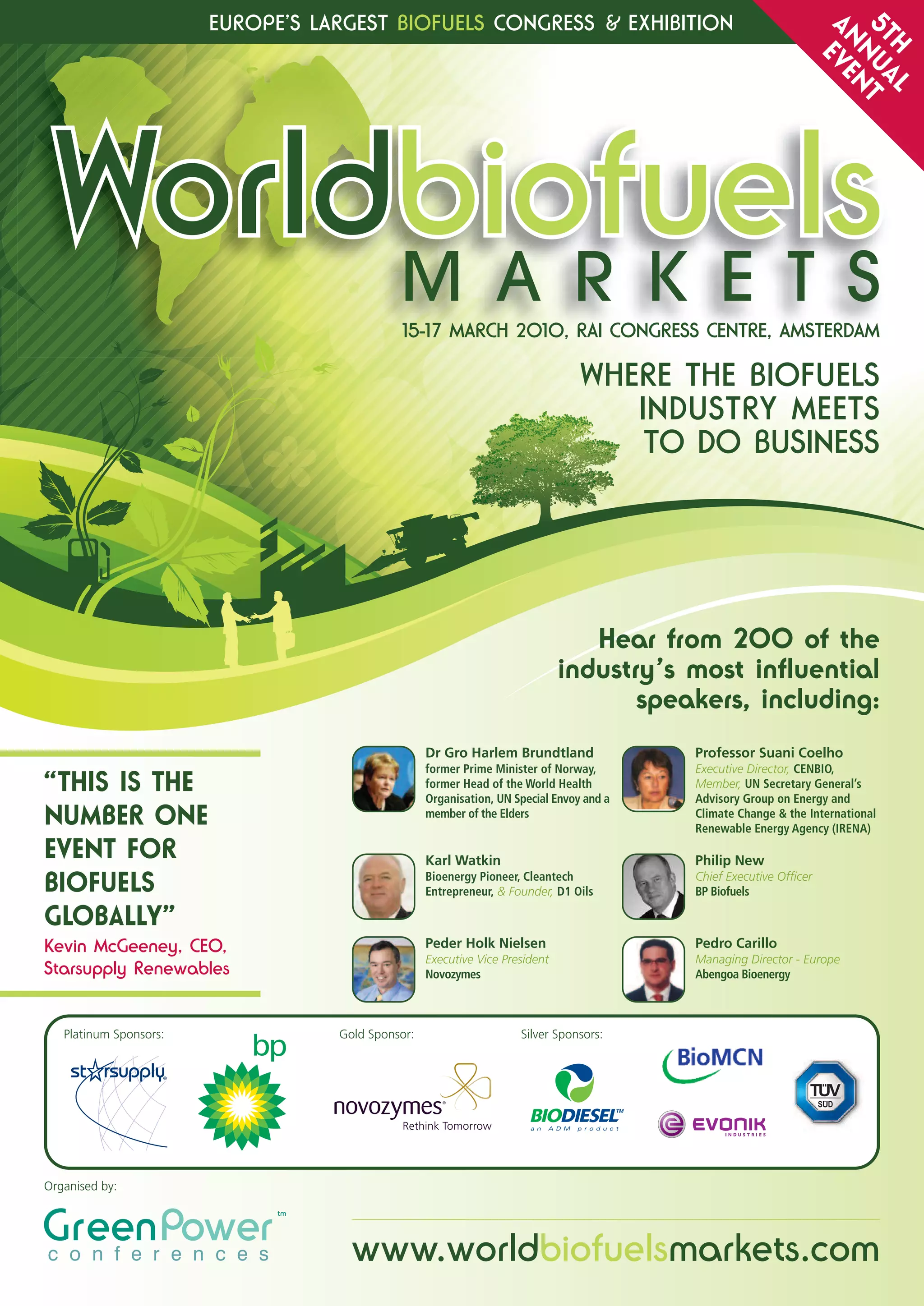 The document announces Europe's largest biofuels congress and exhibition, scheduled for March 15-17, 2010, at the RAI Congress Centre in Amsterdam, featuring 200 influential speakers from the biofuels industry. It emphasizes various conferences covering topics like biofuels technology, trading, sustainability, and developing nations' policies, alongside networking opportunities with industry leaders. The event aims to foster business relationships and provide insights crucial for the future of the biofuels sector.