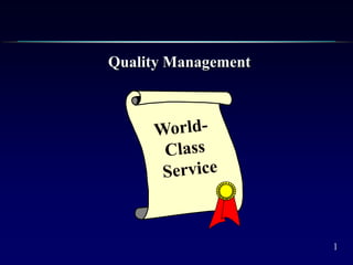 This document provides an overview of quality management and what it takes to achieve world-class status. It defines quality as meeting or exceeding customer expectations. Modern quality management involves adopting total quality management (TQM) programs that focus on continuous improvement, employee empowerment, and designing quality into products and processes. World-class companies implement extensive TQM programs to consistently deliver best-in-class quality and satisfy customers.