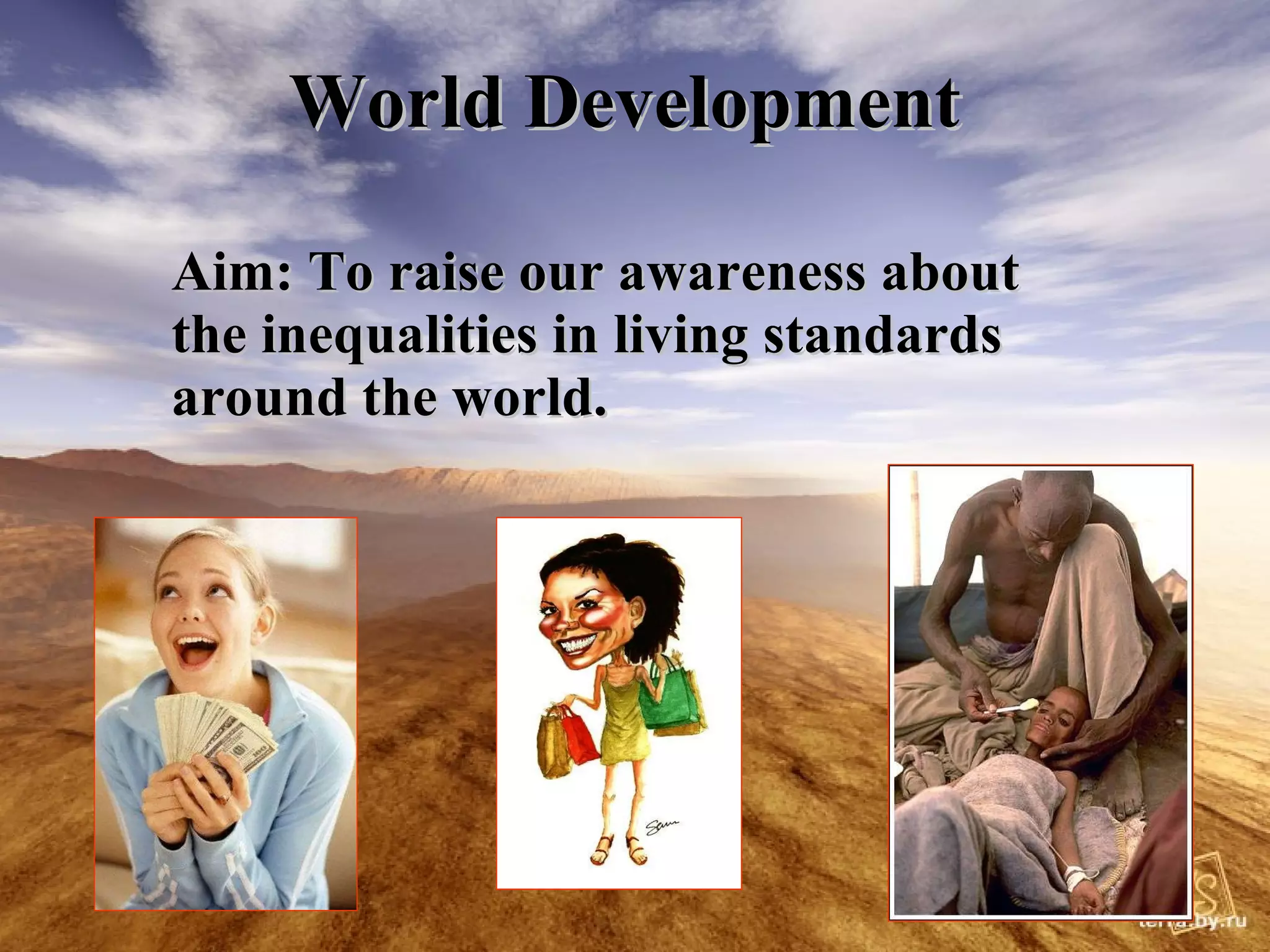 The document discusses inequalities in living standards around the world. It notes that earning £100,000 per year places one in the top 0.12% globally, while earning only £100 per year means over 500 million people live on less. It contrasts life in more economically developed countries (MEDCs) and less economically developed countries (LEDCs), noting that LEDCs often have low-paying jobs, sell raw materials cheaply while buying manufactured goods expensively, high birth/death rates, less access to healthcare and education. Wealth is judged by GNP per capita, with the US and UK as MEDCs and Rwanda and Ethiopia as LEDCs. While LEDCs have less income, some argue they have