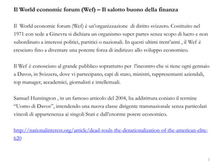 Il World Economic Forum (WEF) è un'organizzazione svizzera fondata nel 1971 che si è affermata come un attore influente nello sviluppo economico globale. Il Global Competitiveness Report del WEF utilizza un indice di competitività che si basa su dati provenienti da sondaggi e fonti esterne, ma è soggetto a critiche riguardo alla sua affidabilità e all'effetto 'Botswana', che mira a mettere in evidenza una percezione negativa della competitività di alcuni paesi, come l'Italia. Le risposte dei manager intervistati nel sondaggio possono risultare non rappresentative e influenzate da bias, sollevando dubbi sull'accuratezza complessiva dell'indice.