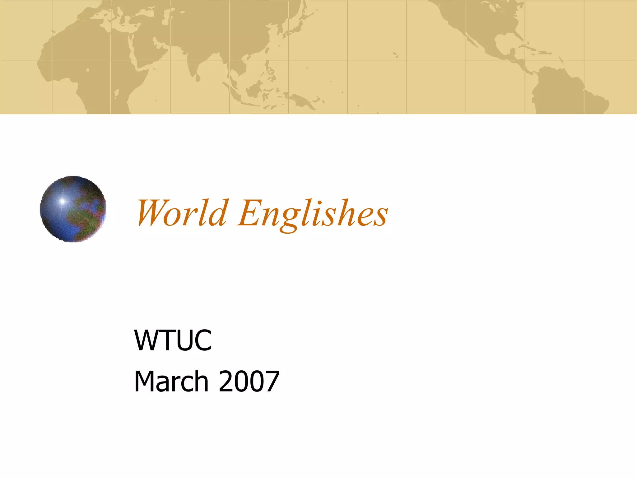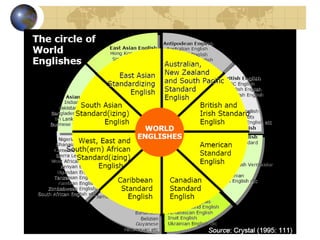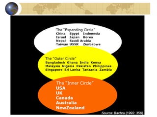 2) Braj Kachru coined the term "World Englishes" to describe the diverse varieties of English that have developed as the language has spread globally. While traditionally only British English was considered the standard, Kachru argued that local Englishes have developed their own rules and norms.