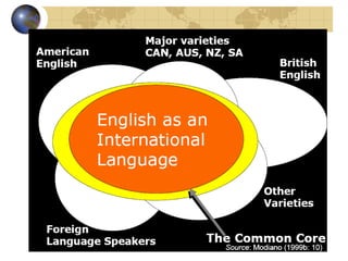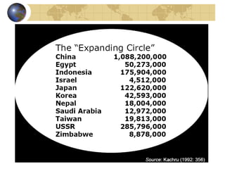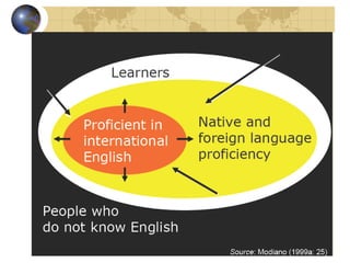 3) English is becoming localized in many countries, taking on aspects of local languages and cultures while still providing a common means of global communication. It is growing as a means of cultural expression rather than solely as