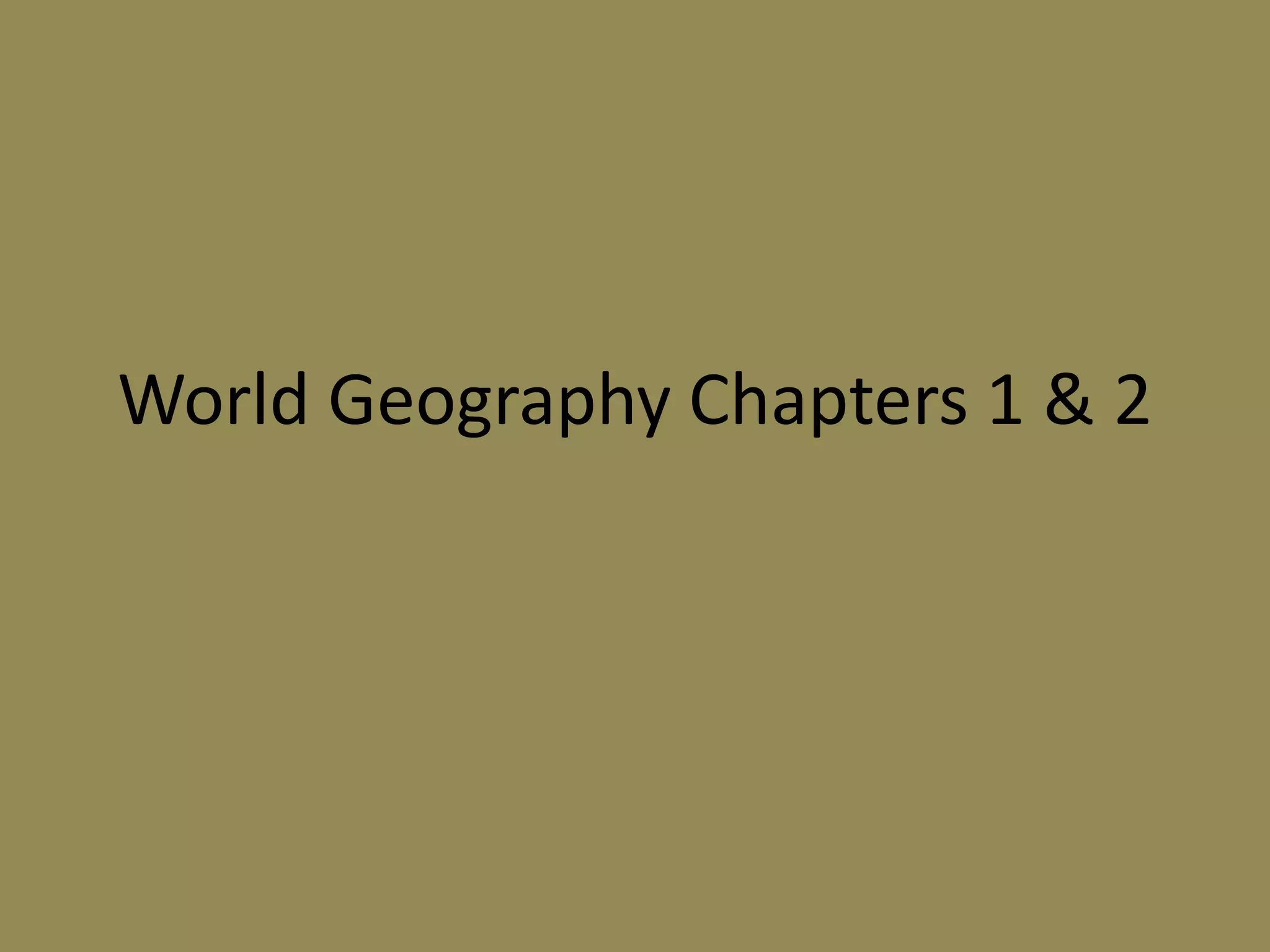 The document discusses key concepts from World Geography Chapters 1 & 2 including the location of Hopkinsville, Kentucky and various regions, ecosystems, layers of the earth, plate tectonics, erosion, glaciers, water cycle, and aquifers. It covers physical geography topics like continental shelves, magma, fault lines, and human geography factors for a city.