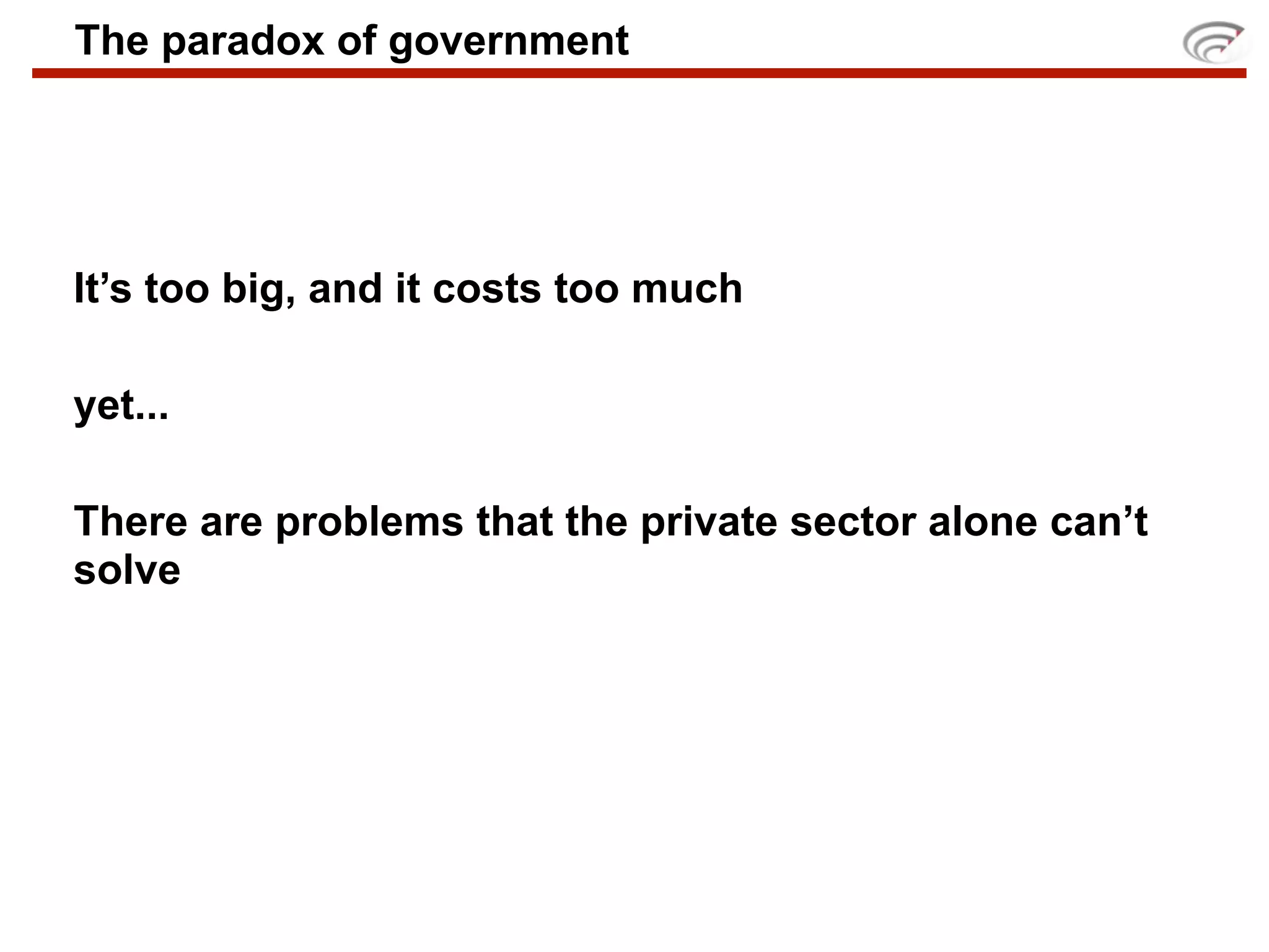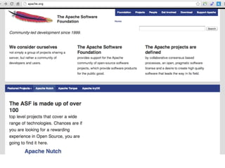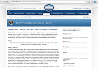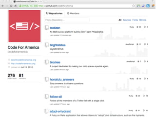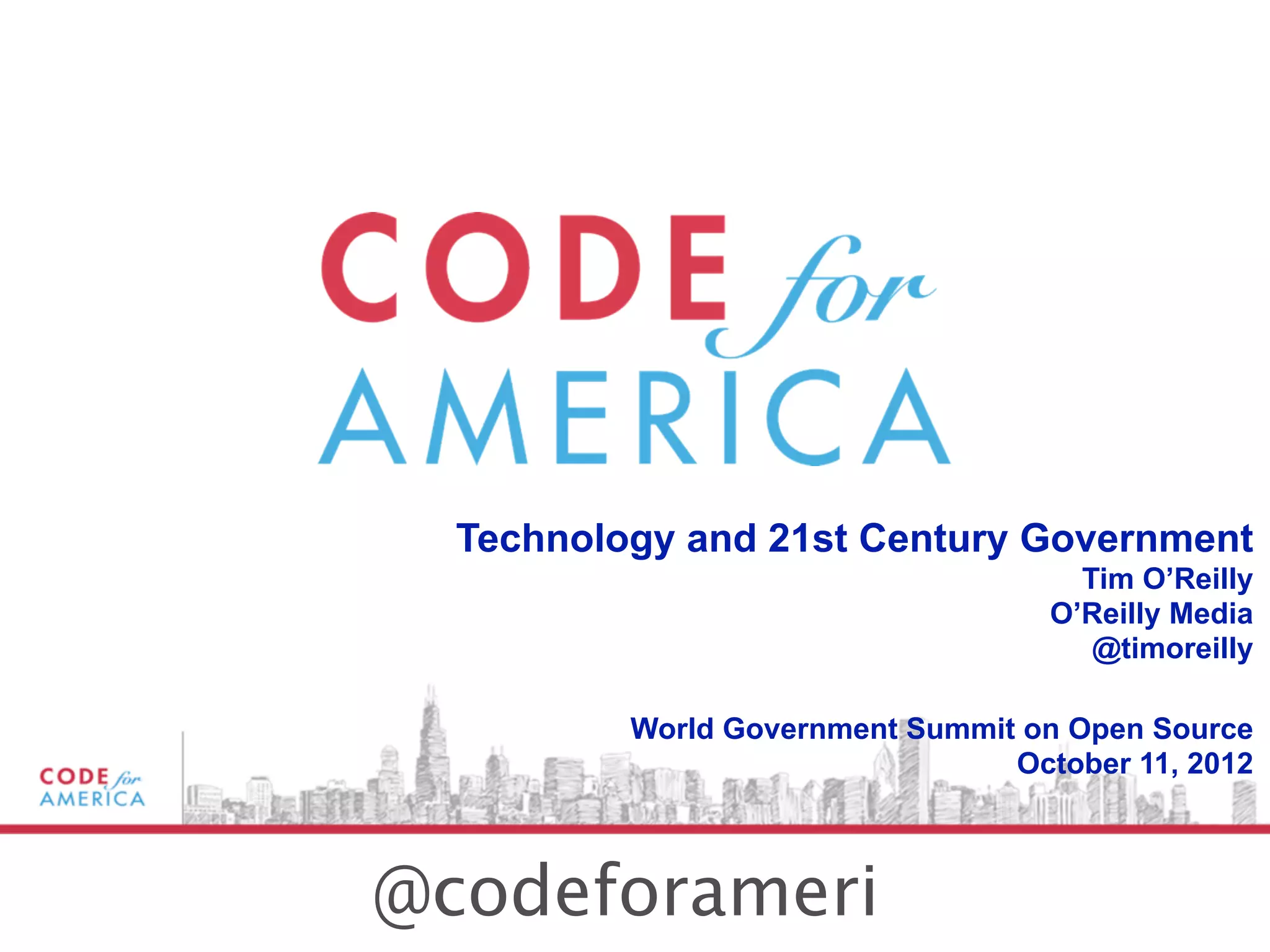 The document discusses the intersection of technology and government, emphasizing the need for government services to be user-friendly and participatory, akin to popular technology platforms. Key lessons include utilizing data for decision-making, fostering community participation, and adopting open-source principles to enhance government functionality. It argues that an open-source approach can significantly improve government efficiency and encourage innovation in civic engagement.