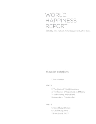 This document is an introduction to the World Happiness Report. It discusses how while technology and economic growth have increased, levels of happiness and life satisfaction have not risen in kind. In rich countries, affluence has led to issues like obesity, addiction, and environmental degradation without improving well-being. Simply increasing GDP does not necessarily improve average happiness. For sustainable development, lifestyles and technologies must improve happiness while reducing environmental impact.