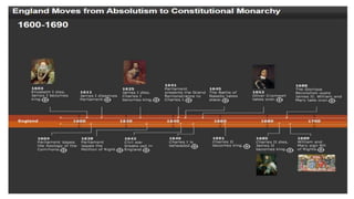 The document summarizes key events and developments in European history between the 16th and 18th centuries. It discusses the witchcraft trials of the 16th-17th centuries, the Thirty Years' War, revolutions in England including the English Civil War and Glorious Revolution, the wars of Louis XIV of France, the rise of Prussia under the Great Elector, and reforms in Russia under Peter the Great. These events helped shape the modern European state system based on Westphalia principles of national sovereignty.