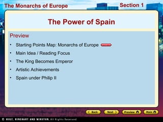2) During the 1500s, Spain experienced a golden age of art and literature under King Philip II. Notable Spanish artists included El Greco and Velázquez, and writers included Cervantes.