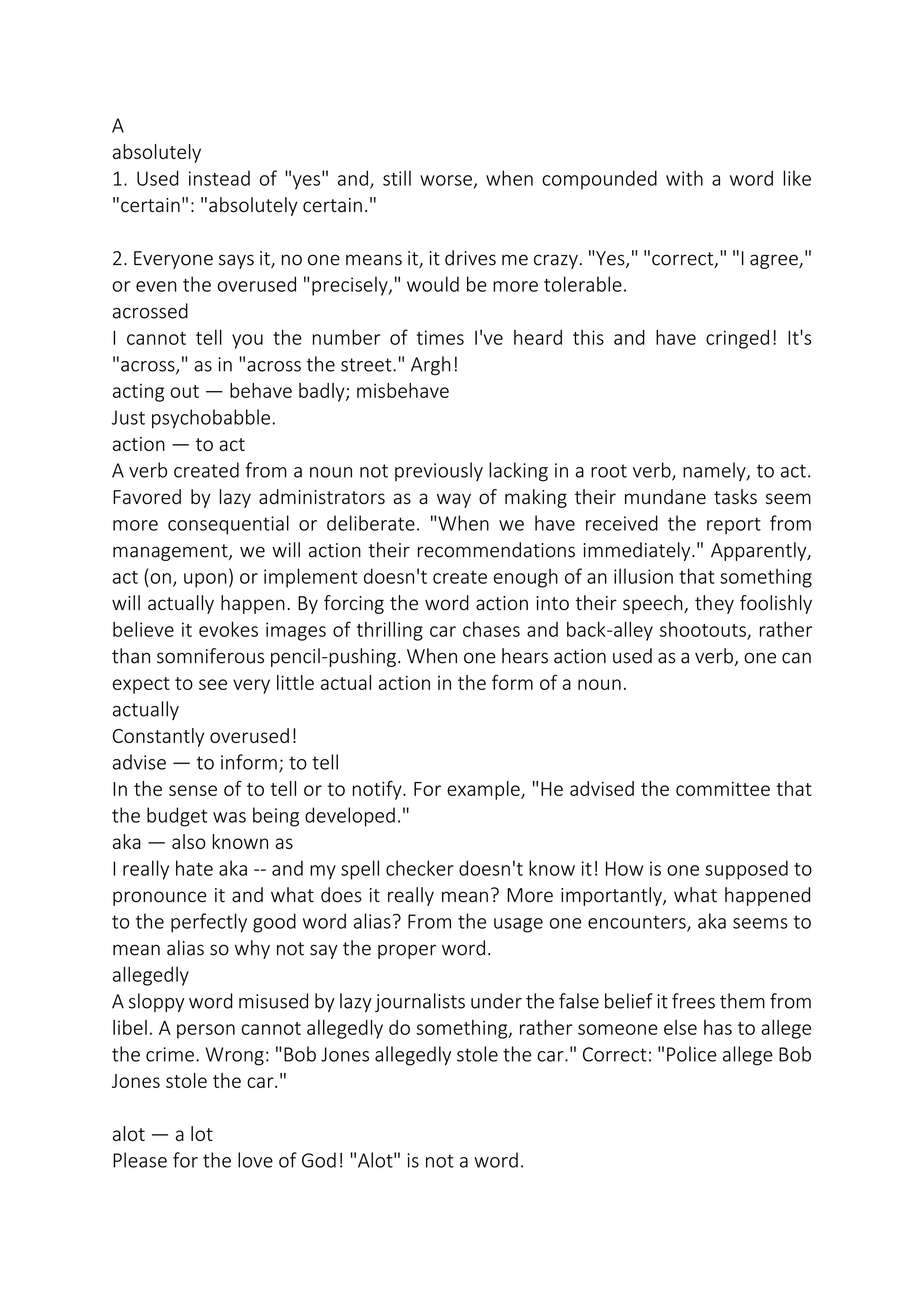 This document contains a list of words and phrases that the author finds annoying or dislikes. Some examples included are "absolutely," "acrossed," "action" used as a verb, "actually," "alot," "amazing," "anyways," "as always," "athalete," "awesome" used to mean good, "big of a deal," "blog," "bottom-line," "bought brought," "bucket" used to mean category, "cervix," "chillax," "chortle," "clean" used as a noun, "cloister," "comfortable," "compartmentalize," "complected," "comprehensive," "consequently," and