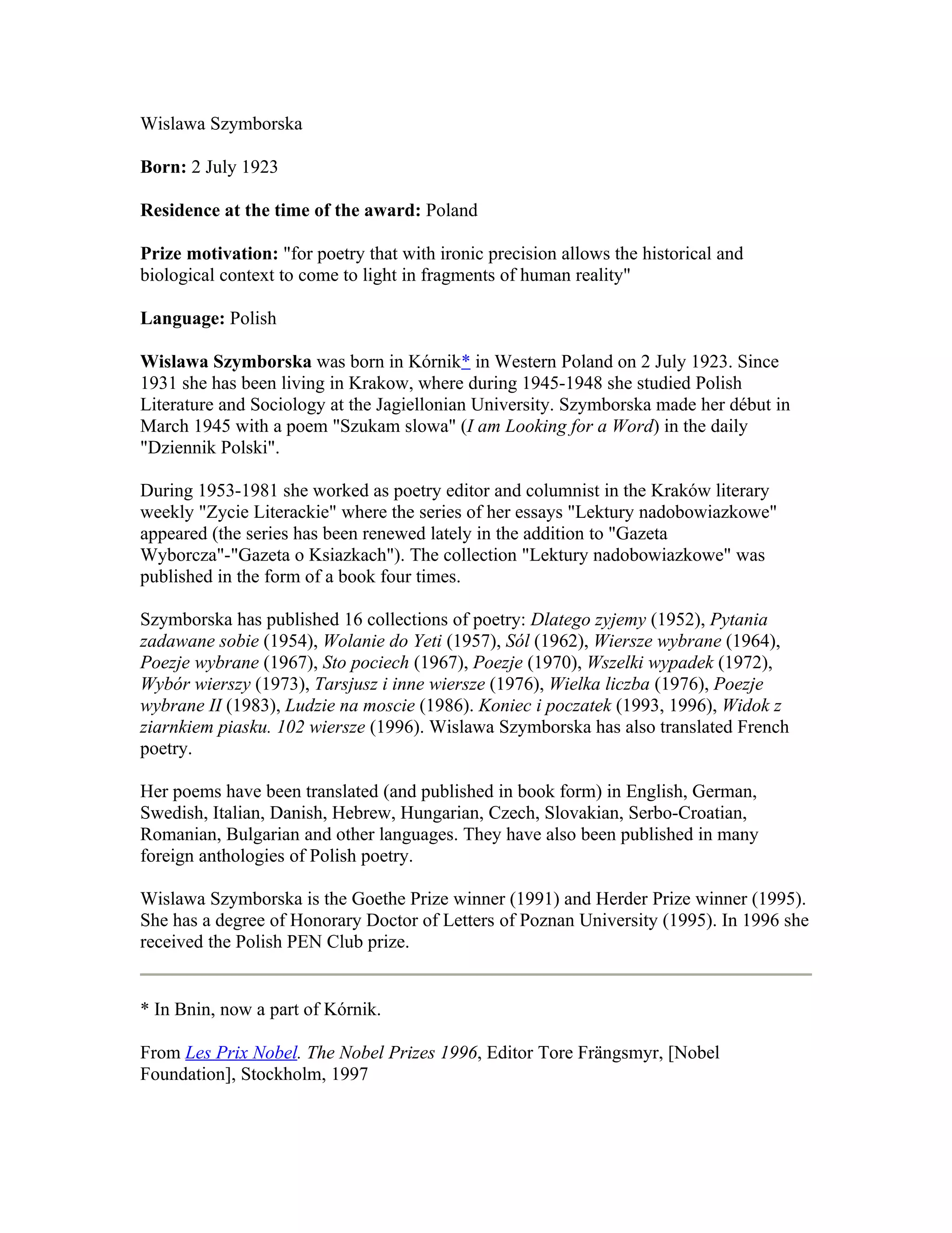 Wislawa Szymborska was a Polish poet born in 1923 in Kórnik, Poland. She studied Polish literature and sociology at Jagiellonian University in Kraków from 1945-1948. Szymborska published her first poem in 1945 and went on to publish 16 collections of poetry. She worked as a poetry editor and columnist from 1953-1981. Szymborska received the Nobel Prize in Literature in 1996 for her poetry that uses ironic precision to reveal aspects of human reality.