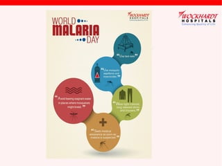 Malaria is caused by a parasite transmitted via mosquito bites that infects red blood cells. The parasites multiply inside red blood cells, which then break open and infect new cells. Common symptoms include fever, chills, and fatigue. Prevention methods include mosquito repellent, medical treatment if suspected, and eliminating breeding grounds. There are three main drug treatments for curing malaria depending on the region.