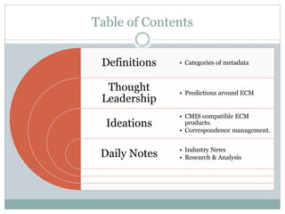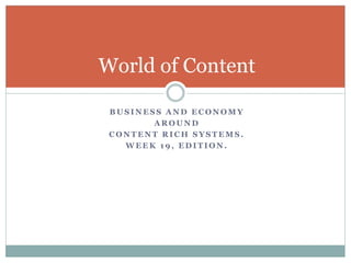 This document provides summaries of content and trends related to content-rich systems for Week 19. It includes categories of metadata, predictions for enterprise content management (ECM) including more cloud usage, CMIS compatible ECM products, strategies for correspondence management, market insights on content clouds and ECM deals, news on partnerships and deals, and proposed research ideas on records, use cases, and designing user experiences.