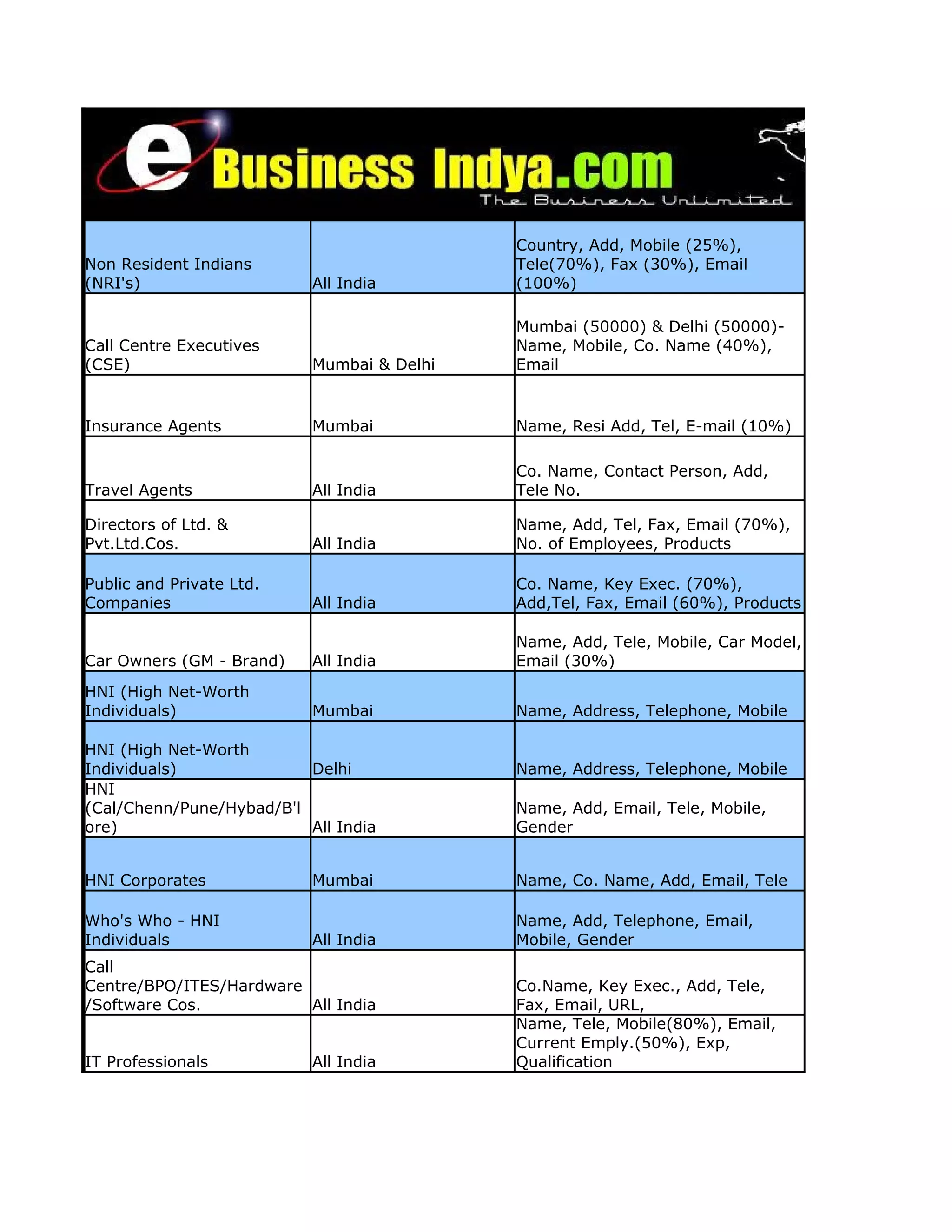 The document details extensive databases containing contact information across various sectors, including individuals and companies in India, targeting demographics like high net-worth individuals, call center executives, and industry professionals. It includes directories for numerous industries such as IT, pharma, real estate, and media, with specifics on contact methods including telephone, fax, and email. Additionally, it outlines global business directories for countries like Australia, Singapore, and the USA, emphasizing services like tele-marketing and email marketing offered alongside the databases.
