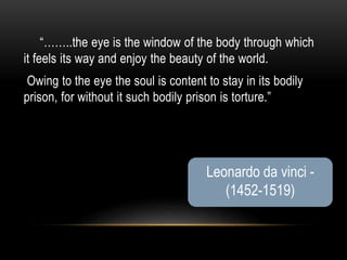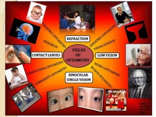 Optometry is a healthcare profession focused on eye and vision care. Optometrists are primary healthcare practitioners of the eye who provide comprehensive eye exams, detect diseases, manage vision conditions, and prescribe corrective lenses or vision therapy. The profession began over 100 years ago with the development of vision science, optics, and optical instruments. Today, optometrists utilize their knowledge of ocular science, disease diagnosis, visual rehabilitation and more to care for patients' eye health and vision needs.