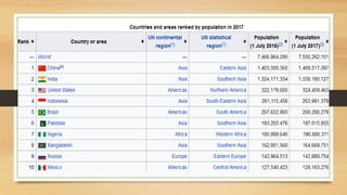 The document discusses population growth and overpopulation. It defines population as all organisms of the same species in a geographical area. Human population growth is a major concern as it affects economic, environmental, and social issues worldwide. The population of India is currently 1.31 billion people. Overpopulation can cause problems like increased poverty, unemployment, food scarcity, and environmental issues. Various countries have implemented policies to control population growth, such as China's former one-child policy, incentives for child spacing in Pakistan, and forced sterilization in Uzbekistan after a second child. Education and development are presented as effective ways to control population.