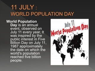 World Population Day is observed on July 11 each year, initiated in 1989 by the UN as a response to rising global population concerns. It highlights issues like adolescent pregnancy, with about 16 million girls under 18 giving birth annually, and emphasizes the need for responsible population control measures. Future projections estimate the global population will surpass 12.5 billion by 2050, urging the importance of adhering to national population policies.