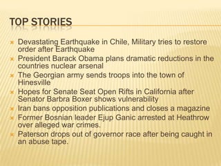 An earthquake devastated Chile and the military aims to restore order. President Obama plans major reductions to the US nuclear arsenal. Georgian troops entered the town of Hinesville. In California, a Senate seat opened amid rifts for Senator Barbara Boxer who showed vulnerability. Iran banned opposition publications and closed a magazine. Former Bosnian leader Ejup Ganic was arrested at Heathrow over alleged war crimes. The Vancouver Olympics ended and player concerns were eased at the Indian Premier League after security promises. Military officials attempting a coup in Turkey were stopped and arrested.
