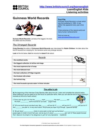 Craig Glenday is the editor of the Guinness World Records book. He discusses his job finding the most extreme records each year for the book. He receives about 1,000 record claims per week and rejects around 98% of ideas as being too silly, dangerous, or unimpressive. Some of the strangest records he mentioned included the biggest collection of airline sick bags and the most tattooed man. His role is to evaluate ideas for how the record will be set and provide details to authenticate new records.