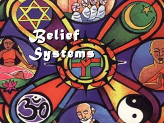 This document provides an overview of several major belief systems including animism, Hinduism, Buddhism, Judaism, Christianity, and Islam. It describes the origins, key beliefs, sacred texts, and spread of each religion. It also discusses how religions can be similar in concepts like karma and dharma, but differ in other beliefs like views on gods and the afterlife. The document aims to help readers understand and compare characteristics of major world religions.
