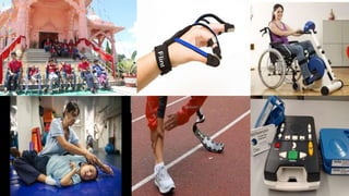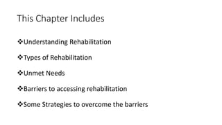 Rehabilitation assists people with disabilities by reducing impairments and preventing complications to help them achieve optimal functioning. However, there are major gaps and challenges to providing rehabilitation services globally. Many people lack access to rehabilitation due to limited resources, specialists concentrated in cities, and long waiting lists. There is also a shortage of rehabilitation personnel worldwide. To address these issues, policies and health systems need reform, financing must be increased through partnerships, and community-based models should be used to decentralize and expand access to rehabilitation services.