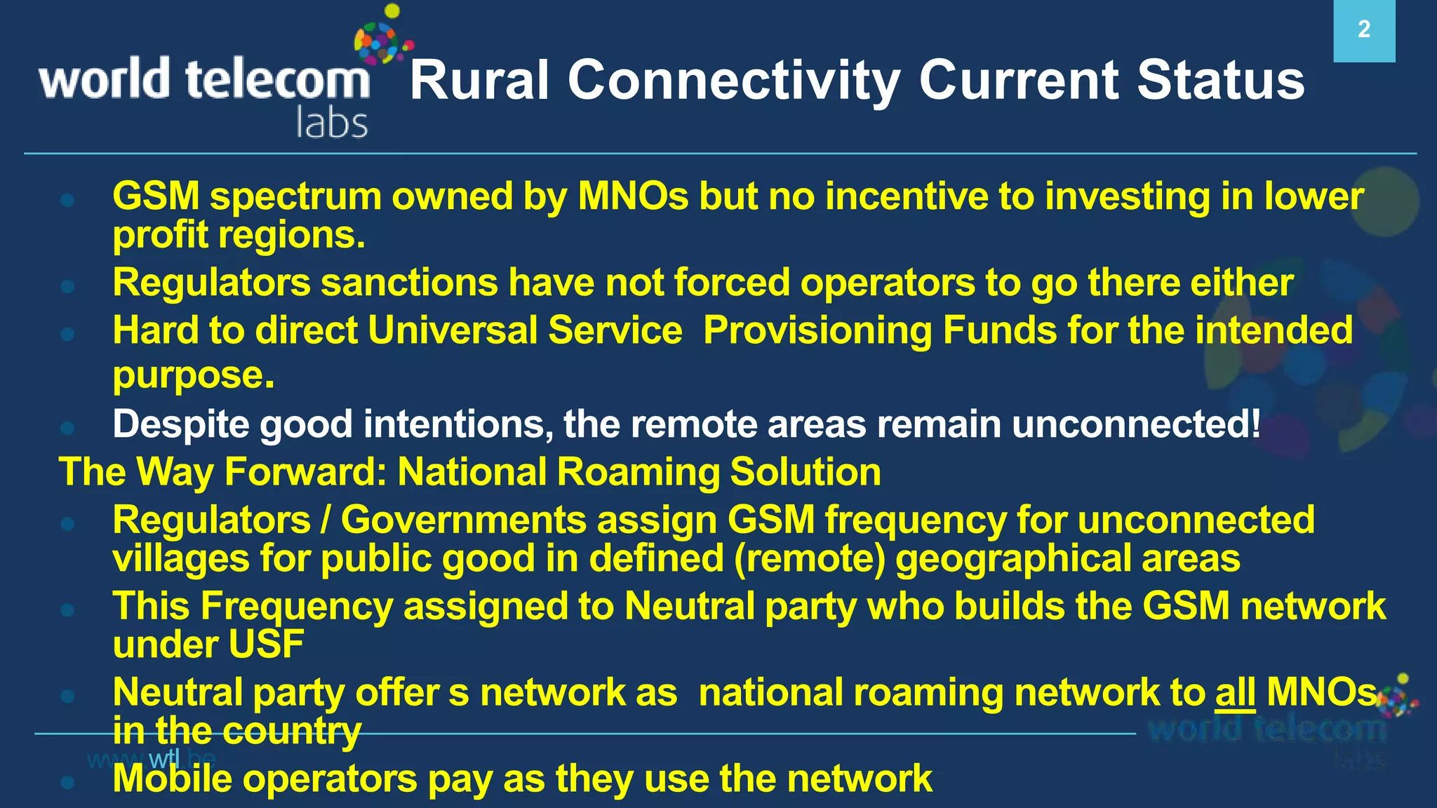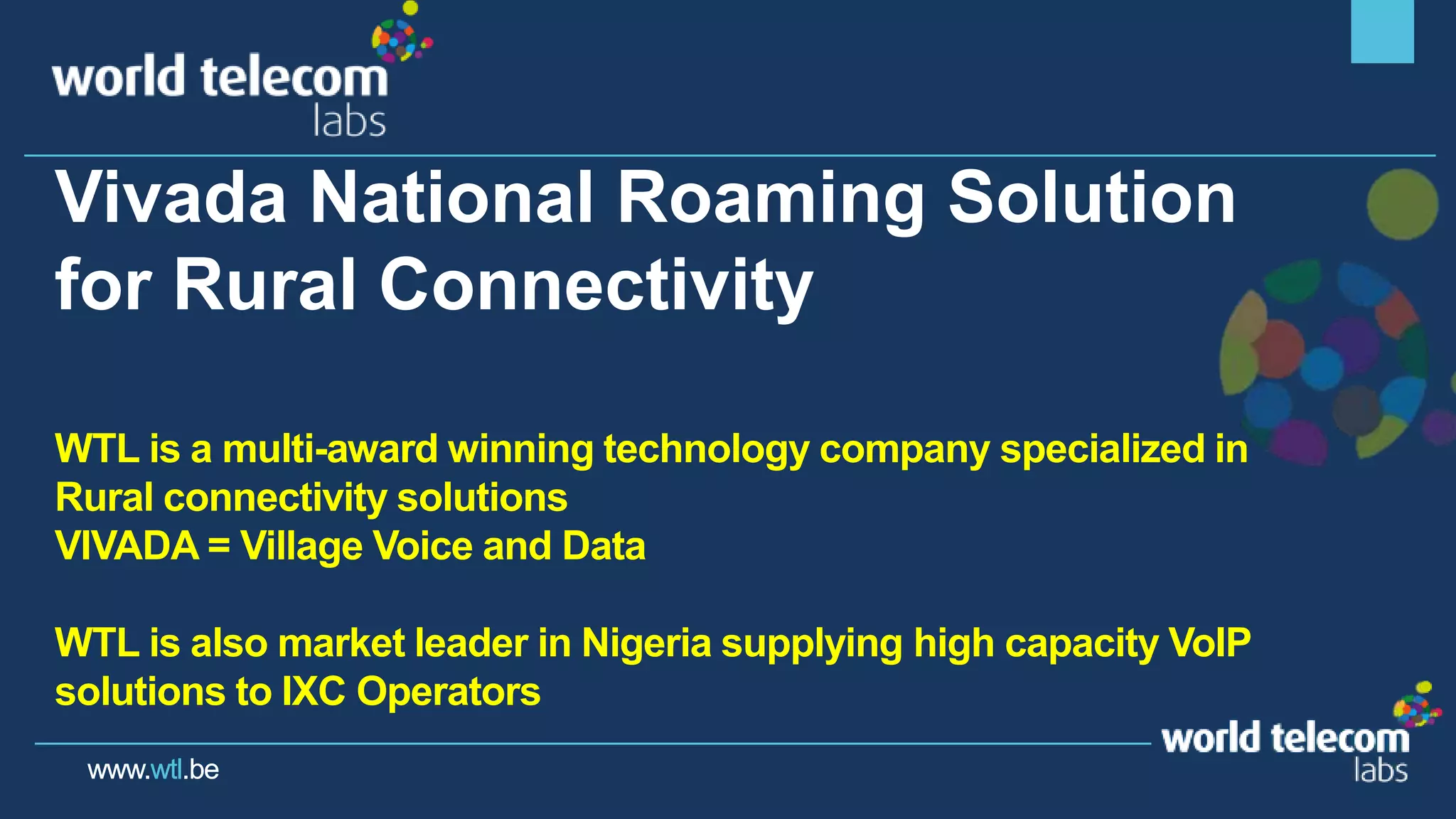 WTL proposes a national roaming solution called Vivada to address rural connectivity challenges. It involves regulators assigning spectrum to a neutral party to build a GSM network in unconnected rural areas using universal service funds. This network would then be offered to all mobile network operators as a national roaming network, allowing them to pay as they use it. Key advantages are reduced capex, quicker coverage expansion, more transparent funding use, and a sustainable pay-as-you-use model.