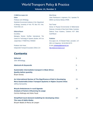 This document is the editorial introduction to an issue of the journal World Transport Policy & Practice. It discusses a recent decision by a local council committee in Lancashire, UK to reject a proposed 20mph speed limit zone in Silverdale due to opposition from residents. The editorial argues this decision will increase the risk of death and injury in the community despite clear evidence that lower speeds reduce crash risks. It calls for a shift towards more sustainable transport mindsets that prioritize safety over mobility. The mindset problem requires working from the bottom-up to empower communities and envision alternative futures, as was done to achieve major policy changes in the past like abolishing slavery.
