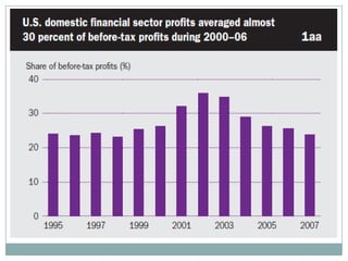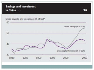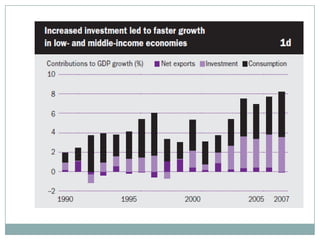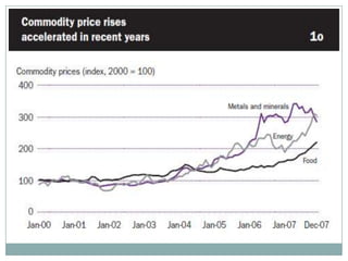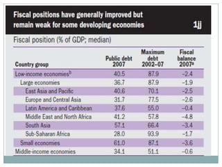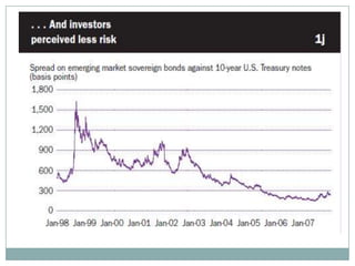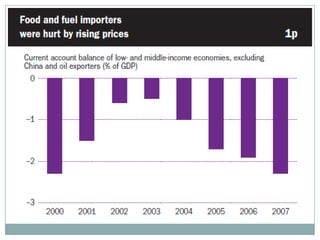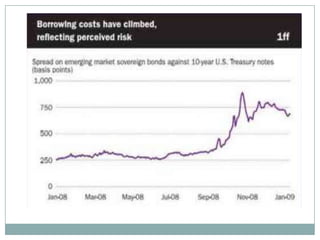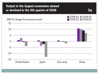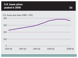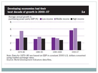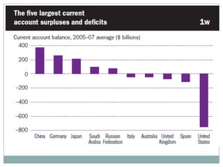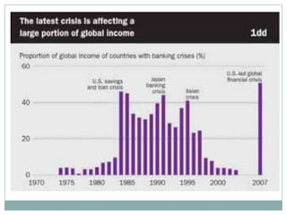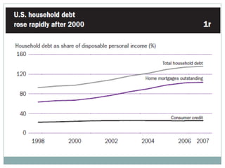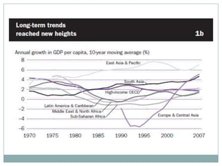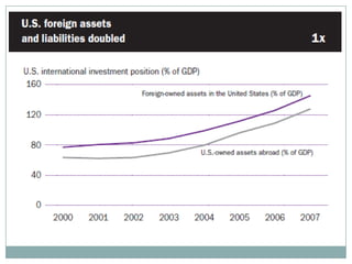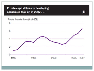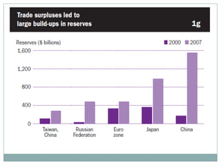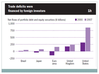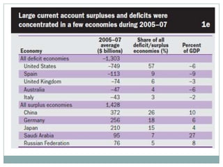 The document summarizes the economic growth in the 2000s, the emergence of macroeconomic imbalances, and the causes and effects of the global financial crisis that began in 2007-2008. It notes that strong economic growth in the 2000s was driven by exports and investment in developing economies. However, imbalances emerged as some countries ran large trade surpluses while others had large deficits, including the US. The crisis had its roots in the US housing bubble and subprime mortgage crisis but spread globally due to interconnected financial markets and a decline in trade. The crisis led to a drop in global output and rise in unemployment worldwide.