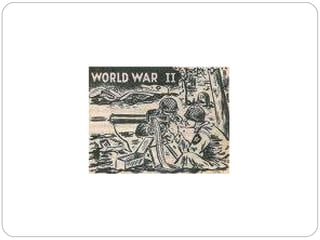The document provides an overview of World War 2, including its causes, main events, and consequences. It discusses 9 causes for WW2 like militant nationalism, imperialism, alliances/ententes, and arms race. Key events outlined include Germany invading Poland in 1939 and Japan attacking Pearl Harbor in 1941. Consequences discussed are loss of lives, weakened economies, America's rise as a superpower, and division of Germany and Japan after the war.