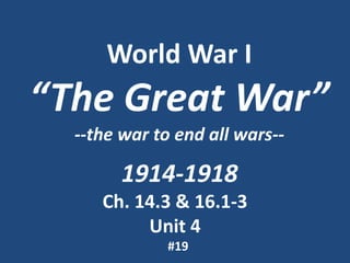 World War I began in 1914 and lasted until 1918. It was known as "The Great War" and was the first major war fought with modern industrial weapons. Trench warfare and machine guns caused unprecedented casualties, with millions of soldiers and civilians perishing across Europe and beyond. New military technologies like tanks, planes, submarines, and chemical weapons transformed the nature of combat. The war ultimately ended in 1918 with the defeat of the Central Powers.