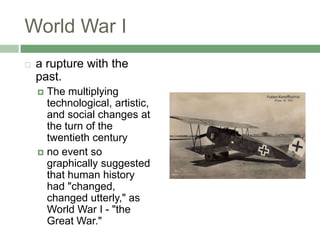 2. It also discusses the lasting impact and legacy of World War 1, how it changed perspectives and led writers to develop new forms of expression to convey the unprecedented horror and disillusionment of the war.
