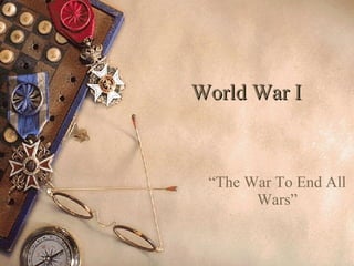 World War I, labeled 'the war to end all wars,' erupted due to four main causes: nationalism, imperialism, militarism, and a complex alliance system. The assassination of Archduke Franz Ferdinand acted as the catalyst for the war, leading to a domino effect of military engagements across Europe. The war was fought on multiple fronts with significant casualties and introduced new warfare technologies, ultimately reshaping global dynamics.