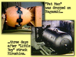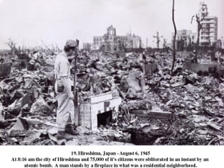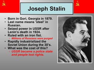 The document provides background information on several key figures in World War II, including Joseph Stalin, Benito Mussolini, and Adolf Hitler. It also summarizes important events such as the Munich Conference, the invasion of Poland by Germany and the Soviet Union, and the Battle of Stalingrad. The document further discusses the Manhattan Project and the atomic bombings of Hiroshima and Nagasaki, which ultimately led to Japan's surrender and the end of World War II.