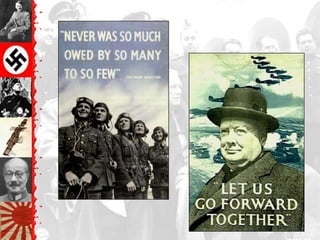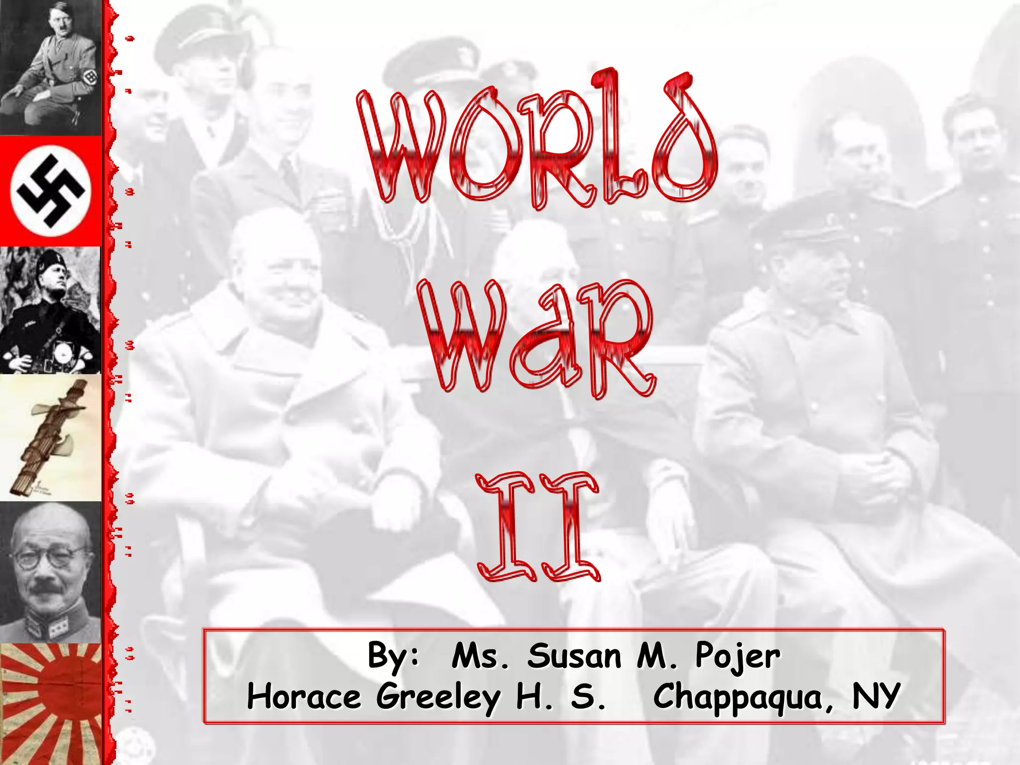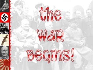 The document provides an overview of key events leading up to and during World War II, beginning with the Versailles Treaty and League of Nations after WWI. It discusses the rise of fascist regimes in Germany, Italy and Japan in the 1930s and their acts of aggression. Major sections cover the outbreak of war in Europe in 1939, key battles on the Eastern and Western Fronts, Allied conferences and strategy, and the war against Japan in the Pacific theater. The document concludes with Germany and Japan's defeat in 1945 and discussions of war crimes and postwar settlements.