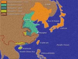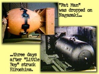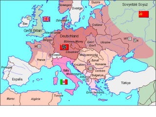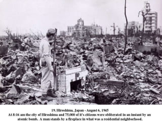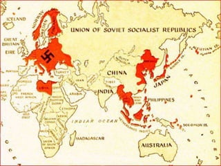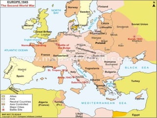 The document provides biographical information on several key World War II leaders such as Joseph Stalin, Benito Mussolini, and Adolf Hitler. It also summarizes important events and battles of World War II, including the Munich Conference, the Battle of Stalingrad, Operation Torch, the Manhattan Project which developed the atomic bomb, and the atomic bombings of Hiroshima and Nagasaki that led to Japan's surrender, bringing the war to an end.