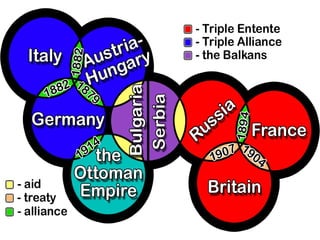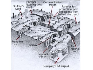 The document summarizes the key causes of World War 1, including militarism, alliances, imperialism, nationalism, and the assassination of Archduke Franz Ferdinand. It also discusses how new weapons like machine guns, poison gas, submarines, airplanes, and tanks led to stalemate trench warfare on the Western Front. The results of WWI included Germany's surrender, the Treaty of Versailles holding Germany responsible, reparations, and the formation of the League of Nations to prevent future wars. Total casualties from all countries exceeded 8.5 million deaths.