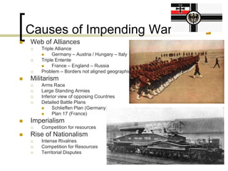 World War I was caused by militarism, imperialism, and the rise of nationalism in Europe which led to the formation of opposing alliances. The assassination of Archduke Franz Ferdinand set off a chain of events that led major European powers to take sides in the war. The initial battle plans failed and resulted in long stalemates and trench warfare along the Western Front. Over 10 million soldiers and civilians lost their lives during the war before an armistice was declared in 1918. The Treaty of Versailles imposed harsh penalties on Germany, sowing seeds for future conflict.
