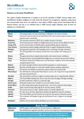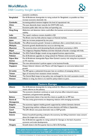 The document is an update from Dun & Bradstreet's country insight services, providing a comprehensive overview of economic and political developments across various regions. It highlights trends in trade credit risk, financial management, and regulatory requirements affecting multiple countries. Key themes include economic challenges, shifts in government policies, and significant market changes influenced by events like the Brexit vote.