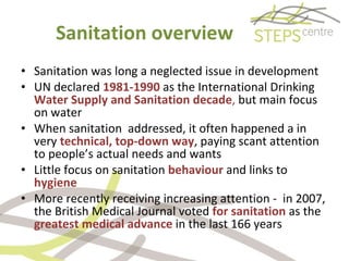 CLTS is an alternative approach to conventional sanitation programs that focuses on changing community attitudes and behaviors through collective action rather than individual support. Key elements include community decision making, social solidarity, and local innovation. The CLTS process involves facilitating workshops to raise awareness of health risks from open defecation and empowering communities to devise their own solutions. While successful in many areas, challenges remain in fully understanding social, ecological, and technological dynamics and how to sustain behavior change long-term.
