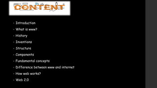 The document provides an overview of the history and components of the World Wide Web (WWW). It discusses how Tim Berners-Lee invented the WWW in 1989 while working at CERN to help scientists share research online. The core components that make up the WWW include clients/browsers, servers, hypertext transfer protocol, hypertext markup language, and uniform resource identifiers. The document also distinguishes the WWW from the underlying Internet and describes how the WWW works using these components.