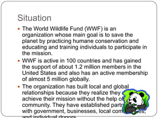 The World Wildlife Fund is launching a campaign to increase awareness of conservation and raise funds. The campaign will include three strategies: 1) A global Earth Day event partnering with Walmart, encouraging employee participation and donations. 2) A school program where children sponsor endangered animals and schools/students receive recognition for contributions. 3) A sustainable textiles initiative where companies sponsor awareness and garments have tags promoting donations. Tactics include Walmart employee clean-up events on Earth Day and offering gift packages for schools/families that join the endangered species program by August. The budget allocates $350k total, including $8k for a donations website, $50k for marketing, and $250k for a TV commercial. The campaign