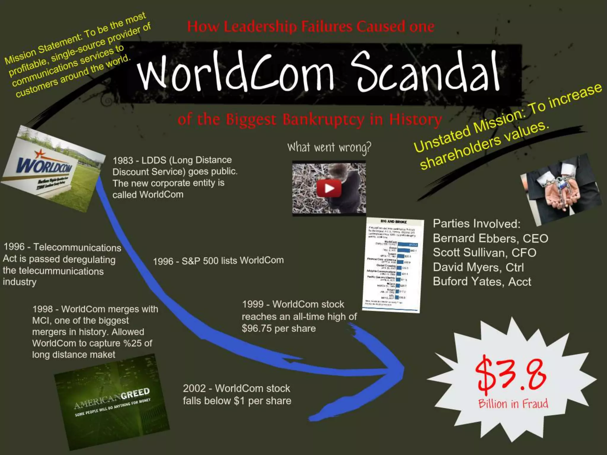 Worldcom was a telecommunications company founded in 1983 that grew rapidly through acquisitions. By 2000, it was one of the largest such companies in the world. However, its aggressive expansion left it struggling with high debt. To hide losses and inflate profits, Worldcom executives under CEO Bernie Ebbers fraudulently reported $3.8 billion in expenses as capital costs. This was uncovered in 2002 by internal auditors Cynthia Cooper and Gene Morse. Worldcom filed for bankruptcy that year in what was then the largest such filing in U.S. history. Ebbers and other executives were convicted of fraud. The scandal led to stricter financial regulations with the Sarbanes-Oxley Act
