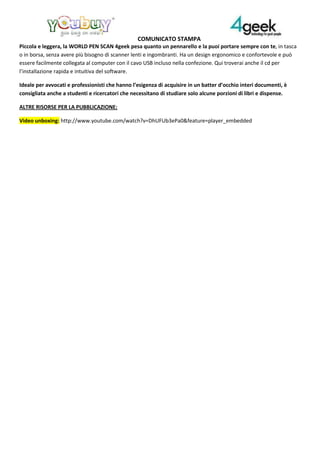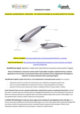 La World Pen Scan 4geek è una penna scanner innovativa che digitalizza, riconosce e traduce testi in tempo reale, permettendo di acquisire porzioni selezionate di documenti cartacei con grande rapidità. Questa penna leggera trasmette i dati direttamente a computer e supporta la traduzione in otto lingue, rendendola ideale per professionisti, studenti e ricercatori. Grazie alla sua maneggevolezza e alle funzioni avanzate, elimina la necessità di scanner tradizionali e ingombranti.