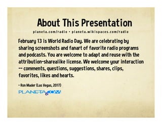 February 13 is World Radio Day, celebrated with fanart and interaction on radio programs and podcasts. Ron Mader shares his favorite podcasts and emphasizes active listening. The document invites engagement through comments and shares.