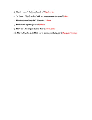 The document contains 10 trivia questions about topics like the Hundred Years' War, Panama hats, and the black box in airplanes. It states that passing requires answering only 3 questions correctly, and provides the answers below.