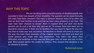 The document presents a presentation on successful role models with disabilities, highlighting figures such as Stephen Hawking, Helen Keller, Marlee Matlin, John Hockenberry, Dr. Salma Maqbool, and Syed Sardar Ahmad Pirzada, who overcame their challenges to achieve remarkable accomplishments. Each individual's story emphasizes the theme that disability does not hinder success and serves as inspiration for others facing difficulties. The presentation aims to motivate individuals to strive for their goals despite limitations, illustrating that personal determination can lead to significant achievements.
