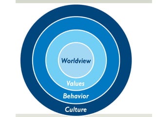 (1) The document discusses what worldview is, how it is formed, and how it can be transformed. It defines worldview as a person's assumptions about reality, based on answering four existential questions, which are formed through the oral tradition and stories of a culture.