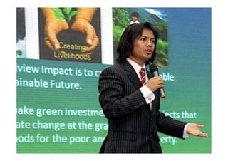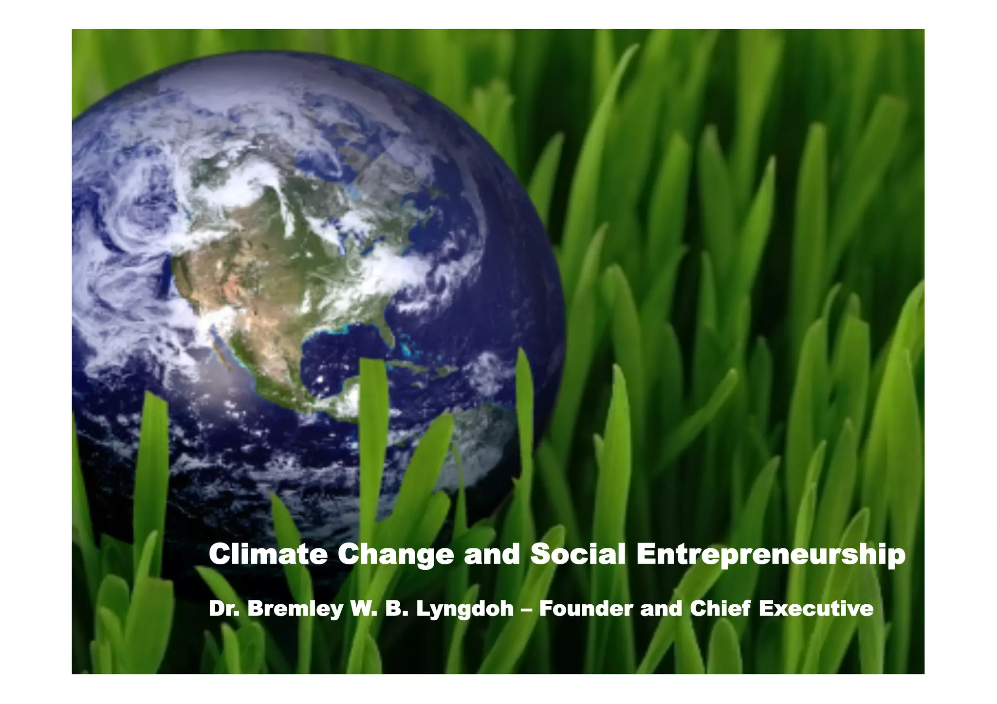 The document discusses Dr. Bremley W. B. Lyngdoh's social entrepreneurship organization called Worldview Impact Foundation. The foundation aims to address climate change through projects that protect the environment, enable local economic growth and support social development. It has pilot projects in Sri Lanka, India, Kenya, and Brazil focused on renewable energy, sustainable livelihoods, rainforest protection, and poverty reduction. The foundation is aligned with the UN's sustainable development goals and seeks to replicate its vision globally with support from partners.