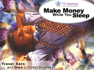 This document introduces a home-based business opportunity with TVI Express that allows people to earn income and receive travel benefits. It notes that many people are unhappy with their 9-5 jobs and want more freedom and fulfillment. The opportunity involves selling TVI Express's travel and lifestyle products and building a distribution network in over 150 countries. For a $250 fee, new distributors gain access to luxury vacations, travel discounts, and tools to run the business from home. The goal is to become "diamond" level and achieve financial independence. TVI Express is presented as a pioneering company in the network marketing industry with a record of rapid early growth.