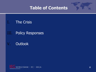 The document discusses the global financial crisis triggered by the U.S. sub-prime mortgage bubble, highlighting severe economic downturns across both developed and emerging markets. It outlines policy responses, emphasizing the need for coordinated global actions to stimulate economies, manage poverty, and address environmental concerns. The outlook is uncertain, with rising poverty and unemployment, stressing the importance of policy interventions and international cooperation to achieve long-term recovery and sustainable growth.