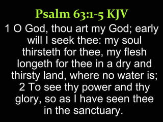 This document summarizes a sermon on worship based on Psalm 63:1-5. It defines worship as engaging with God through singing, giving, attending gatherings, serving in the church, listening, and helping. The sermon notes that worship is compulsory and discusses phrases from the scripture passage about thirsting for God. It examines the conditions of modern life and calls for persistent worship with both spirit and flesh. The sermon emphasizes expressing worship through action, lips, hands, and mouth.